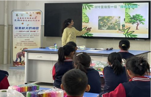 《秋天的大树为什么要“脱衣服”?》课堂伊始,老师以“自然侦探”的身份亲切问候每位同学,引发了孩子们浓厚的兴趣。在“我们的疑问?”环节,老师通过对比夏绿秋黄的树木图片,引导同学们积极思考、踊跃发言。随着课程深入,当听到“小精灵用阳光做魔法,给大树制造好吃的”时,孩子们睁大了好奇的眼睛,仿佛亲眼见到了树叶中忙碌的绿色小身影。这堂充满童趣与温情的落叶科普课,在孩子们的欢声笑语中圆满结束。相信这个秋天,每当走过飘满落叶的小路,孩子们都会想起那棵会“脱衣服”的聪明大树,和它背后那段关于生命与成长的美丽秘密。