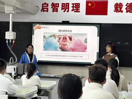 《从哪吒传说到未来科技--一株莲藕的跨学科狂想曲》课堂上,两位老师分别扮演神话人物“太乙真人”与“哪吒”,以轻松幽默的小品形式开场,迅速点燃了现场气氛。随后,课程围绕莲藕展开跨学科探索,从植物学角度解析莲藕的结构、生长特性及其“藕断丝连”的独特现象。通过丰富的图片、动画以及莲藕的切片和显微镜观察实验,同学们不仅直观感受到莲藕结构的奇妙,也对神话中“莲藕化身”的情节有了科学层面的理解。在回溯传统文化的同时,进一步延伸至前沿科技领域。主讲人介绍了武汉轻工业大学在“莲藕造骨”技术方面的研究成果,以通俗的语言阐释科研原理,并鼓励同学们关注科学细节、培养探索精神。现场气氛活跃,同学们在欢声笑语中感受到科学的魅力。