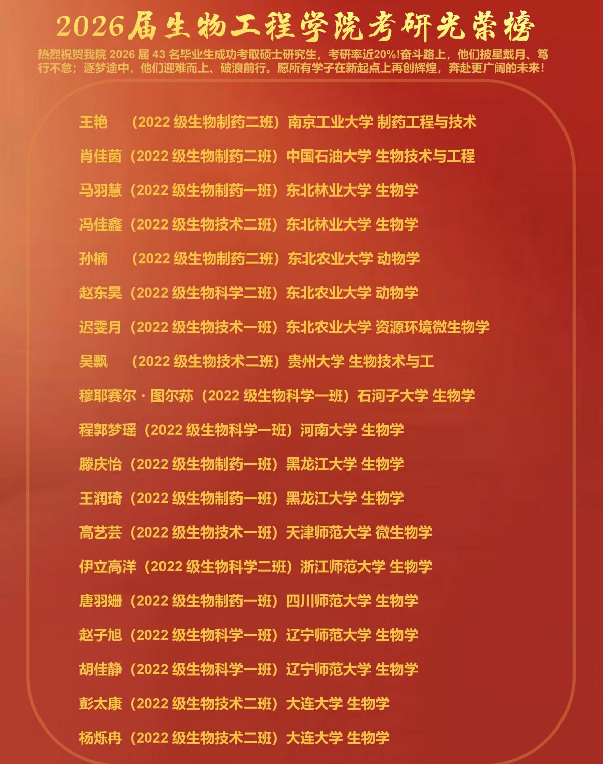 本次考研工作中,生物工程学院本科毕业生共计247人,其中,有96名学生踊跃报考、全力应考,43名同学成功被国内各大高校录取,考研录取率达44.8%,考研率接近18%,升学整体成效稳中有进、考研录取率再创历史新高。